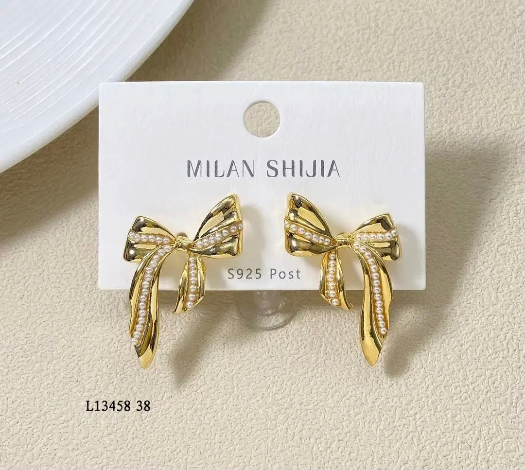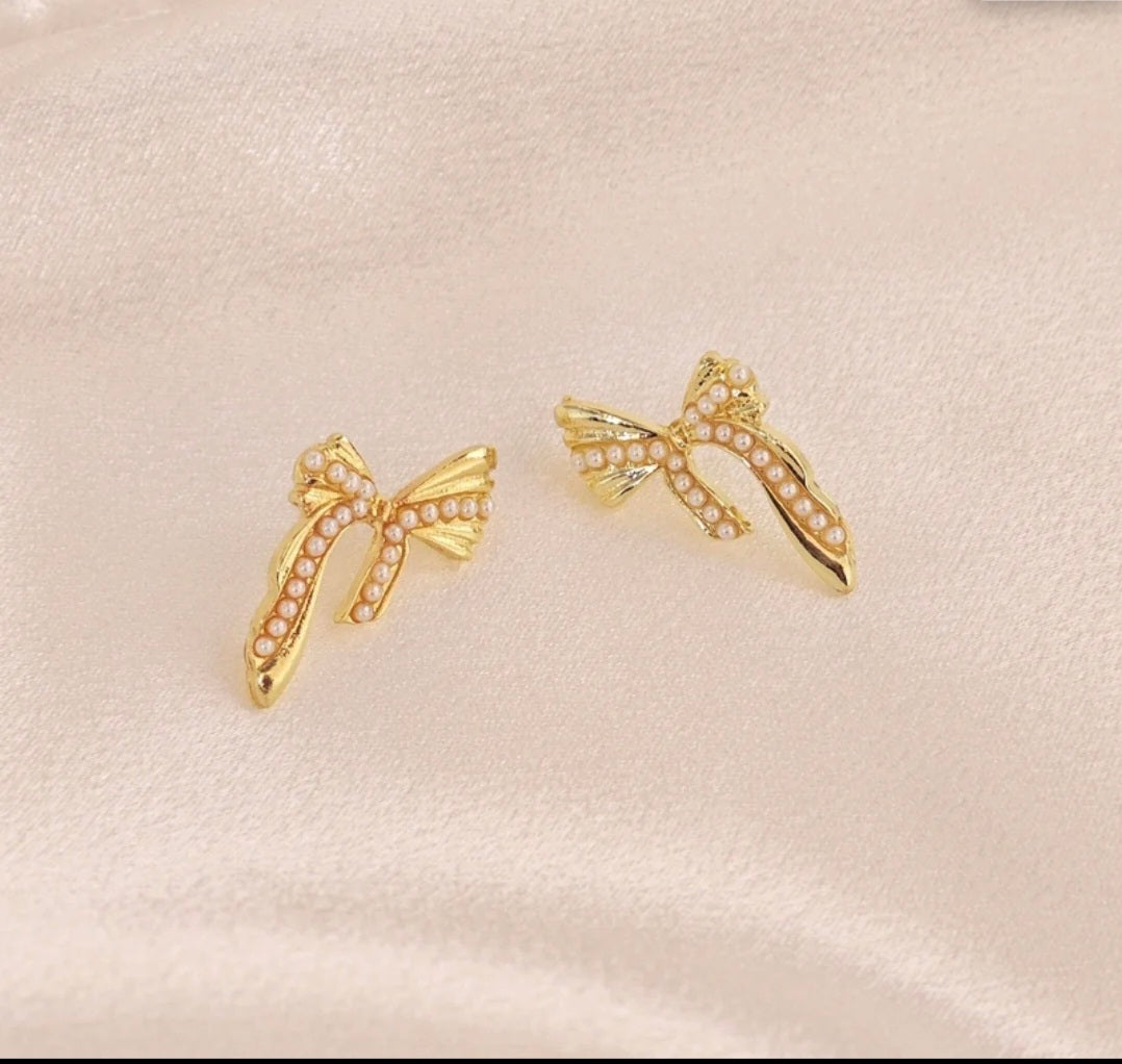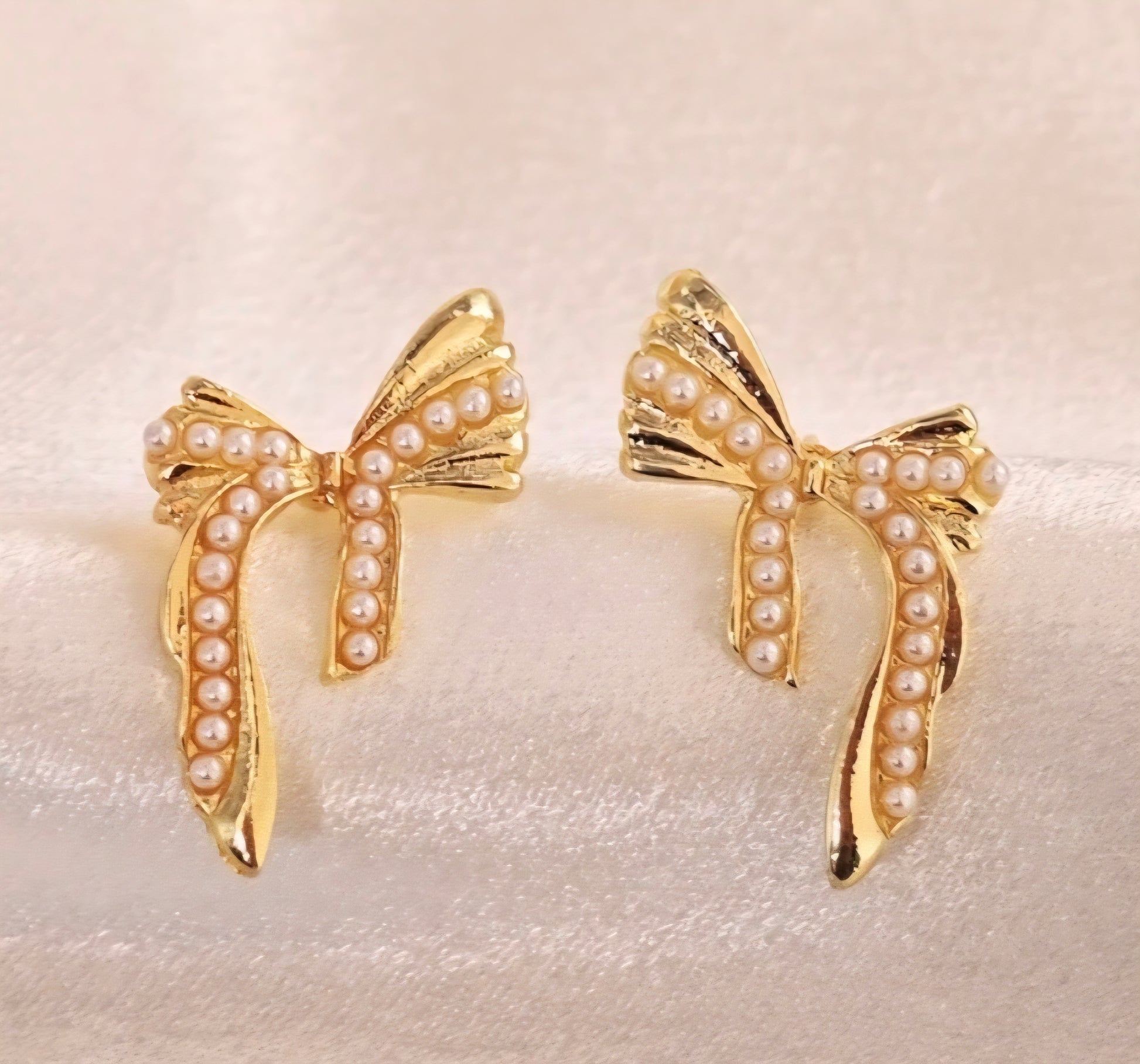 Elevate your look with the Jasper Bow With Pearls—a fearless statement piece that commands attention. These golden high-low bow studs feature intricate pearl detailing that catches light with every movement, blending timeless elegance with bold sophistication. Perfect for those who refuse to play it safe, these studs transform any outfit into an expression of confidence and refined style.