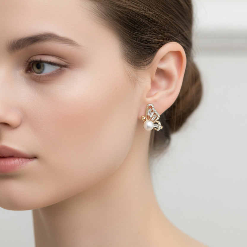 Delicate butterfly studs that flutter into your heart! These charming earrings feature a lustrous pearl at the center, elegantly framed by sparkling silver zirconia and shimmering diamond accents. Perfect for adding a touch of whimsy to everyday looks or special occasions, these studs combine timeless elegance with a playful spirit. A sweet reminder to embrace your inner butterfly and let your personality shine bright.