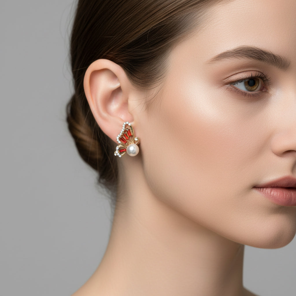 Delicate butterfly studs that flutter into your heart! These charming earrings feature a lustrous pearl at the center, elegantly framed by sparkling red zirconia and shimmering diamond accents. Perfect for adding a touch of whimsy to everyday looks or special occasions, these studs combine timeless elegance with a playful spirit. A sweet reminder to embrace your inner butterfly and let your personality shine bright.